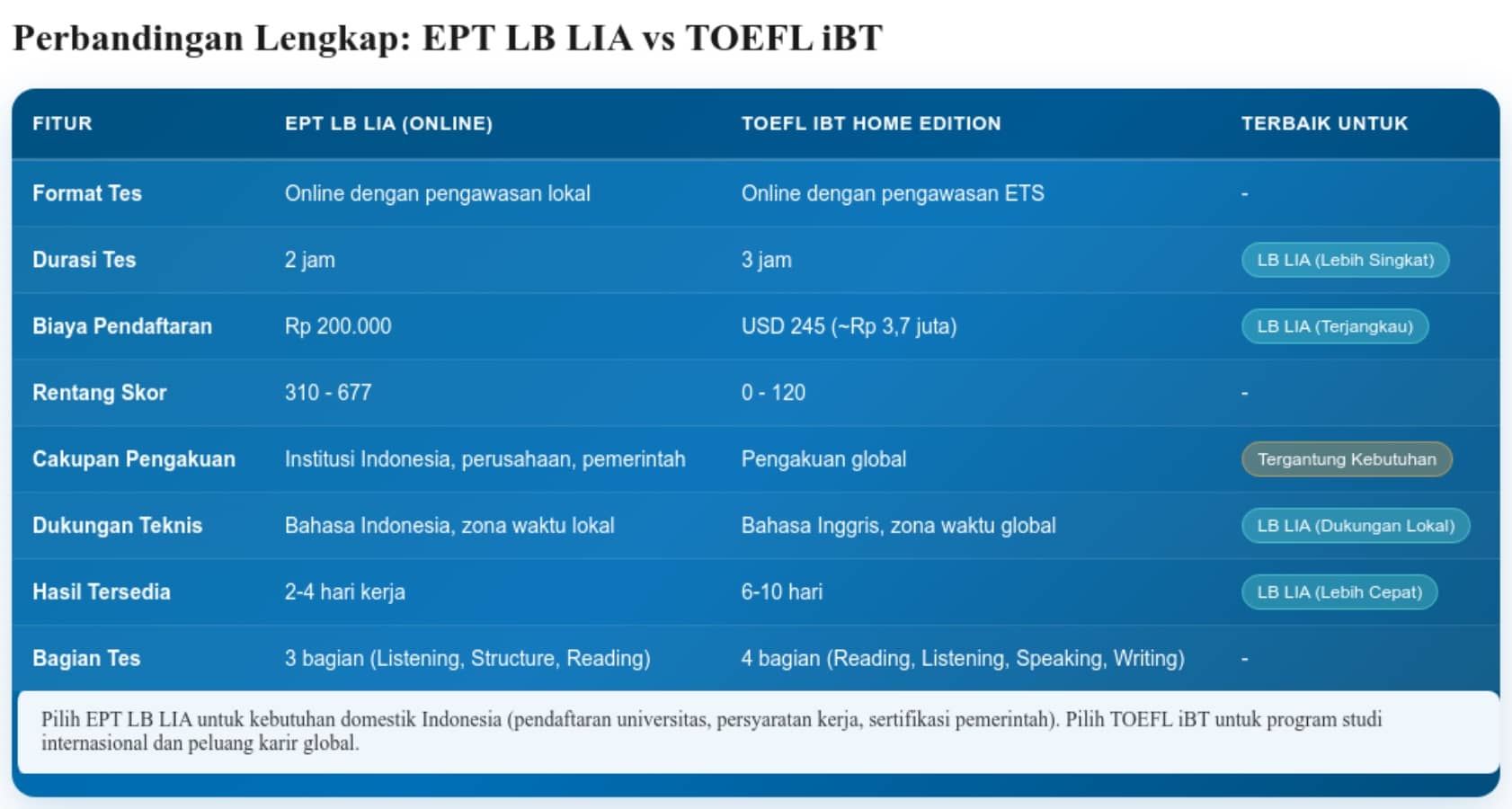 Biaya tes TOEFL online LB LIA (EPT) yaitu Rp 200.000, jauh lebih terjangkau dibanding TOEFL iBT Home Edition yang mencapai USD 245 (~Rp 3.7 juta). Ini menjadikannya alternatif cost-effective untuk kebutuhan sertifikasi bahasa Inggris di Indonesia.
